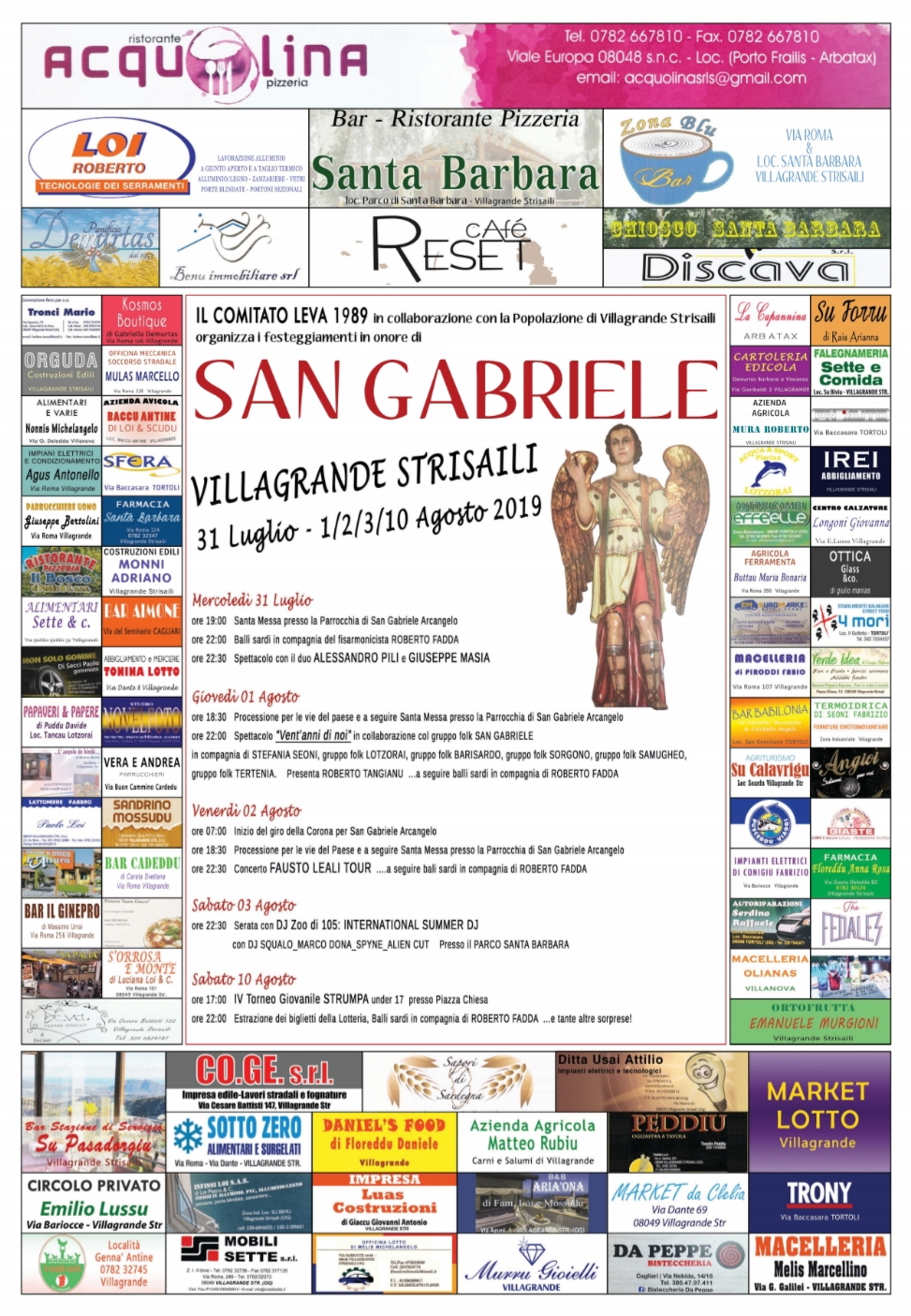 Con ordinanza n. 42 del 29 luglio 2019 il Sindaco ordina, nei giorni 31 luglio 2019, 1 e 2 agosto 2019, dalle ore 20.00 fino alle ore 02:00, per poter svolgere i festeggiamenti del Patrono di Villagrande Strisaili San Gabriele Arcangelo, la modifica alla circolazione veicolare con l’istituzione del divieto di circolazione veicolare e di sosta, quale momento statico della circolazione, fatta eccezione per i veicoli di soccorso e primo intervento e quelli della Forza Pubblica, nel modo seguente:
