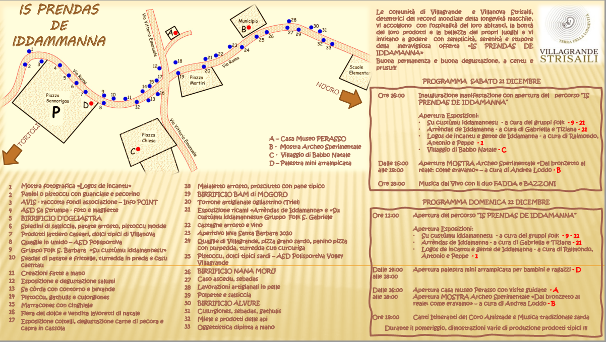 Per poter far svolgere la manifestazione fieristica di rilevanza locale denominata “IS PRENDAS DE IDDAMANNA” che si svolgerà in Villagrande Strisaili nei giorni: sabato 21 dicembre dalle ore 15.00 alle ore 24.00 e domenica 22 dicembre dalle ore 9.00 fino alle ore 24.00; con ordinanza n. 60 del 17/12/2019 il Responsabile dell'Area Vigilanza e Commercio ordina la modifica alla circolazione veicolare con l’istituzione di un divieto di transito e divieto di sosta, ad esclusione dei veicoli utilizzati dagli organizzatori, di quelli della Forza Pubblica e di soccorso e primo intervento, per i giorni sabato 21 dicembre 2019 dalle ore 15.00 fino alle ore 24:00 e domenica 22 dicembre 2019 dalle ore 9:00 alle ore 24:00 di cui ai punti sotto meglio indicati: